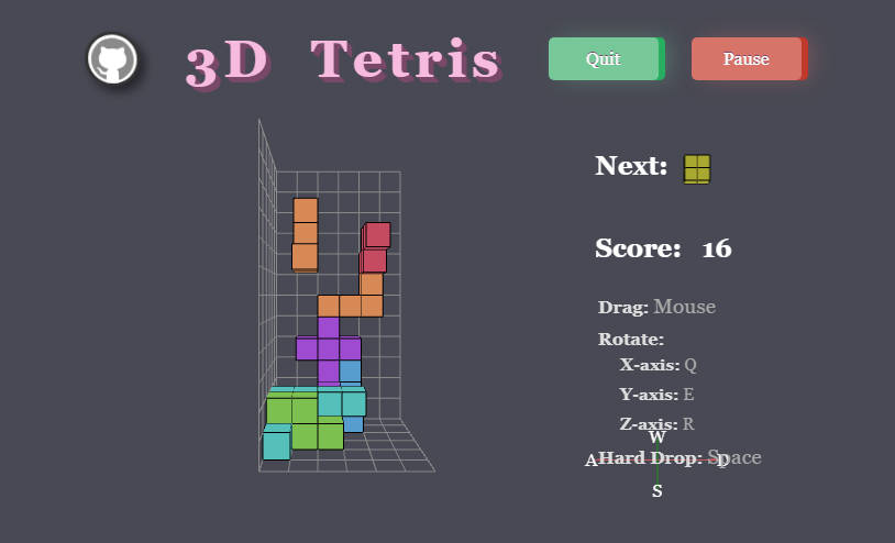 A 3D tetris game built with Three.js and React by React 2023-10-13 threejs-tetris-react a 3D tetris game built with Three.js + React + TypeScript View Demo View Github Get Started npm install npm run dev