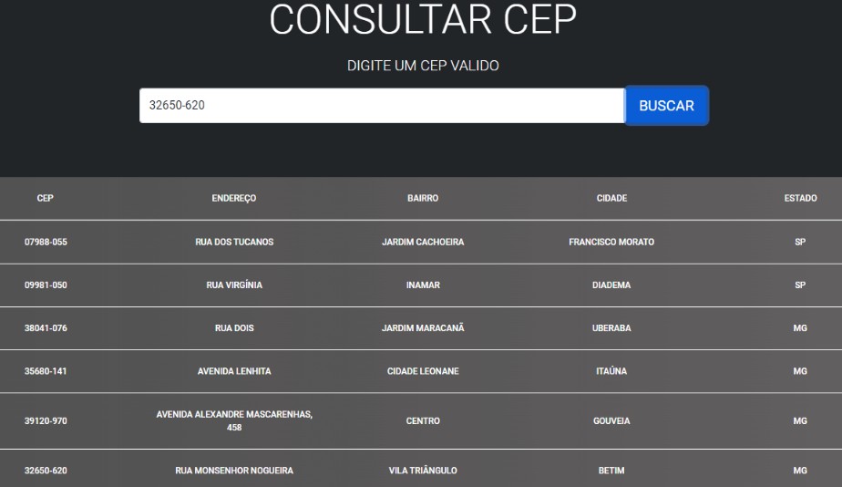 Mais um projeto para estudos usando react para consultar o cep usando API, basta digitar o seu cep e ele mostra o Bairro, Rua, Cidade, Cep, e Estado.