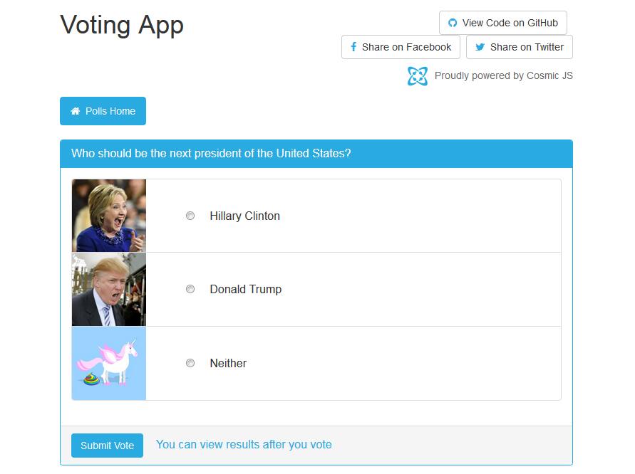 A voting app that uses React for UI, MobX for state management, React Router for smooth view transitions, Cosmic JS for the CMS API, React Bootstrap for the frontend framework, Shorti for easy inline styles.