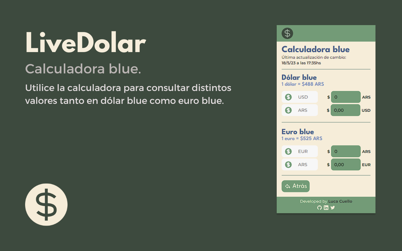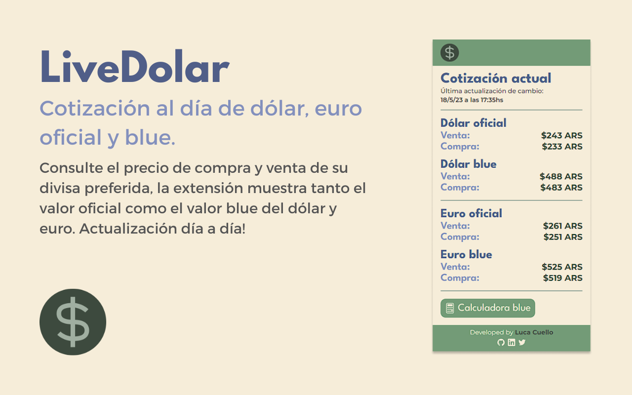 Extensión de Chrome y Opera pensada para uso regional en Argentina que mediante un llamado a una API, devuelve el valor diario del dólar oficial, dólar blue, euro oficial y euro blue. Además, incluye una calculadora para poder visualizar la conversión entre un valor custom en pesos y el valor del dólar/euro blue y viceversa. La misma fue creada con React y TypeScript mediante el uso de CRXJS, usando librerías externas como react-icons para los iconos y framer-motion para las animaciones.