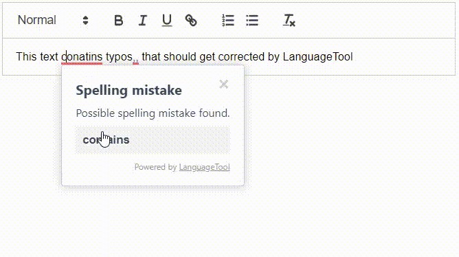 A live demo can be found at https://vantezzen.github.io/quill-languagetool. The source code for a complete example with react-quill can be found in /example.