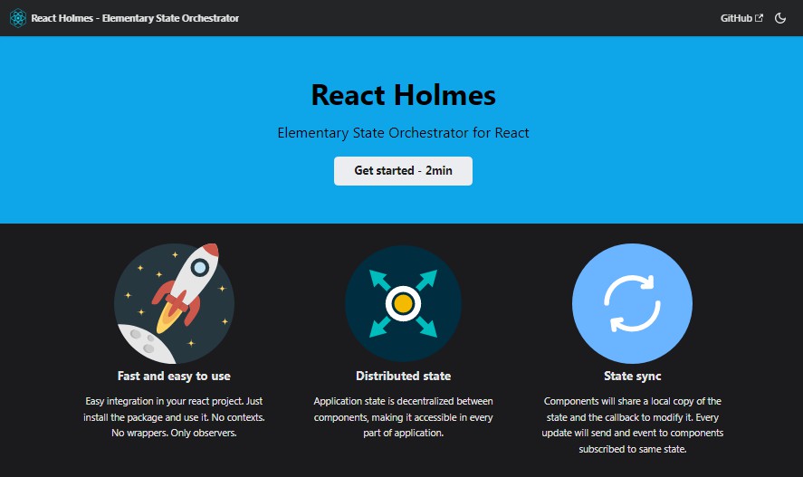Holmes has a very minimal API. It is as simple to use as React’s integrated hooks, but all state is globally accessible.