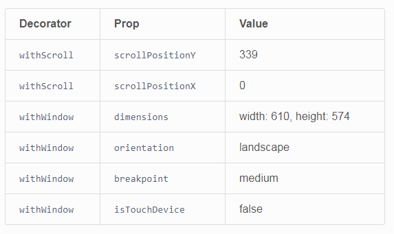 Two decorators (higher order components) that inject "window" scroll position, dimensions, orientation and breakpoint to your component's props.